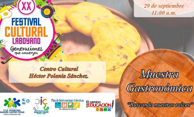 Con el objetivo de fomentar la alimentación saludable, haciendo uso de productos autóctonos de la región, personal del Plan de Intervenciones Colectivas – PIC departamental, en representación de la E.S.E Manuel Castro Tovar y el Instituto Colombiano de Bienestar familiar ofrecerán degustación de platos realizados con estos productos a la población asistente a la segunda muestra gastronómica en el marco del festival cultural laboyano, organizado a nivel municipal, este domingo 29 de septiembre a las 11 de la mañana.