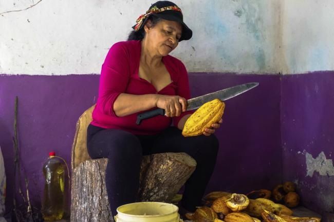 Angélica Mazo abre mazorcas de cacao. Las almendras del cacao se fermentan por cinco días antes de que las tueste y las muela, produciendo bolas amargas y fuertes de puro chocolate que vende en mercados campesinos. (Foto por Alex Diamond)