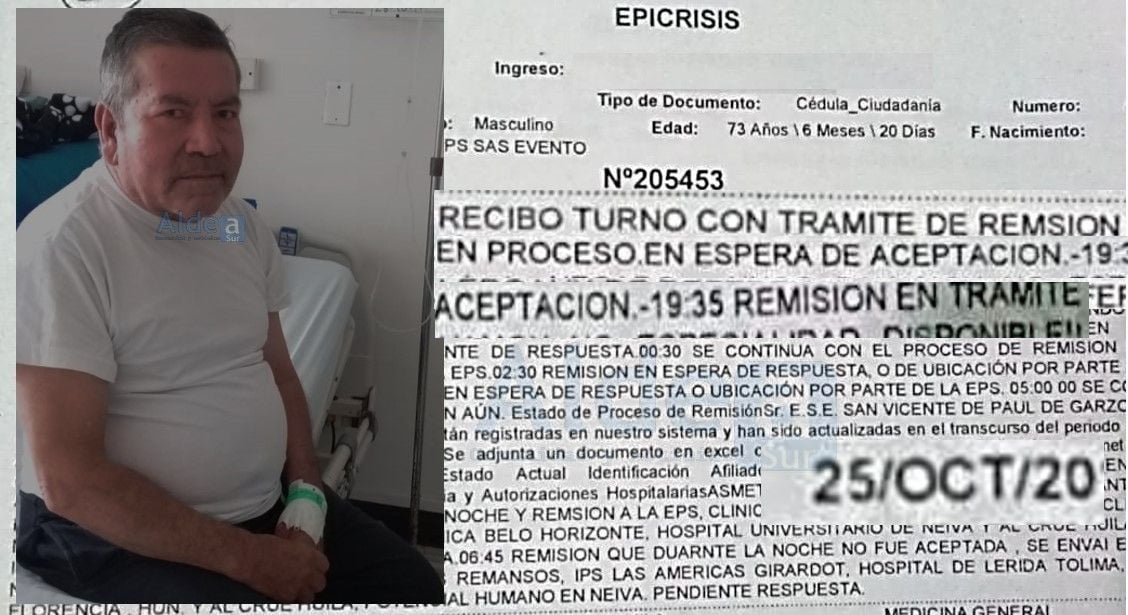 Fue entregado a sus familiares, sin recibir la atención requerida, razón por la cual su salud se deteriora y en estas mismas condiciones su familia tendrá que ingeniarse la forma de desplazarse en un medio de trasporte público desde su lugar de residencia en Suaza, hasta la capital del departamento con un recorrido aproximado de 3 horas y 15 minutos por una carretera en mal estado; tiempo que para una persona de su edad y estado de salud seguramente se convierten horas amargas de viaje.