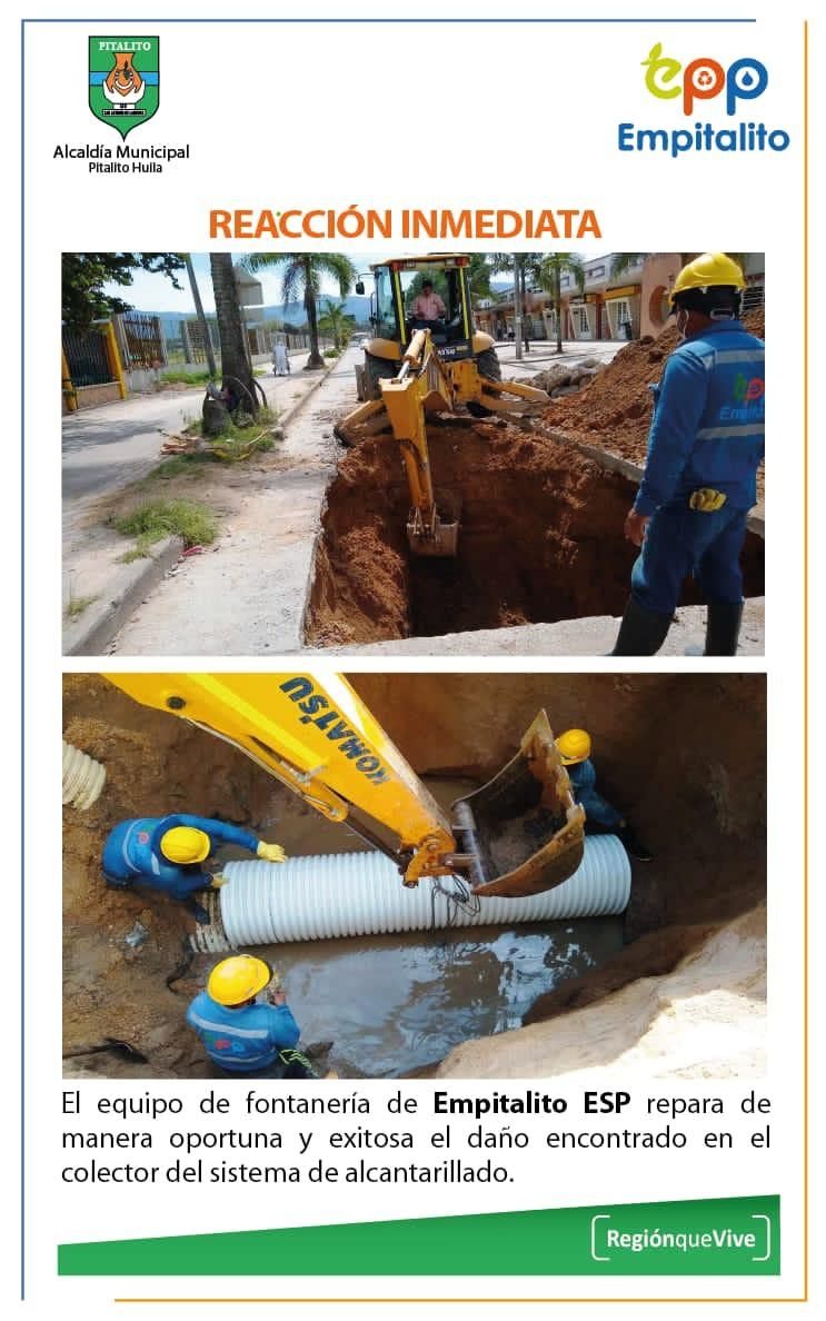 El gerente de Empitalito, ingeniero Henry Lizcano, atendió los trabajos, acelerando los procesos para que se corrigiera en menos de 24 horas dicha situación indicó a través de un comunicación en donde resaltó el trabajo y compromiso de los operarios de la empresa de servicios públicos de Pitalito.