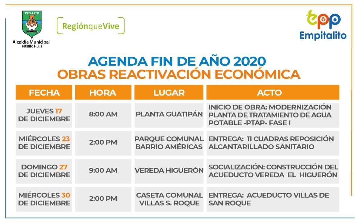 Con una agenda de obras de reactivación económica se socializaran con la comunidad varias acciones de la empresa de servicios Públicos en Pitalito indico la gerencia de la entidad.