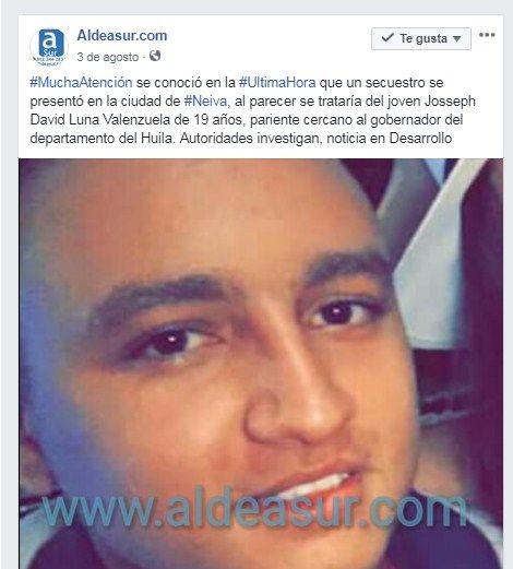 Después de más de cuarenta días del secuestro del joven Josséph David Luna Valenzuela. Las autoridades capturaron a tres personas, en la ciudad de Neiva, Huila, quienes serían presuntamente los autores materiales e intelectuales del plagio.