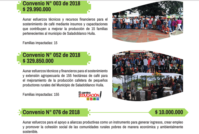 El sector café permitió la movilidad en recursos que pueden superar los 800 millones de pesos en convenios que afianzan el sector en áreas como siembra y producción, alianzas productivas, sostenimiento de café, extensión agropecuaria, mejoramiento de la producción cafetera, insumos agrícolas entre otros.