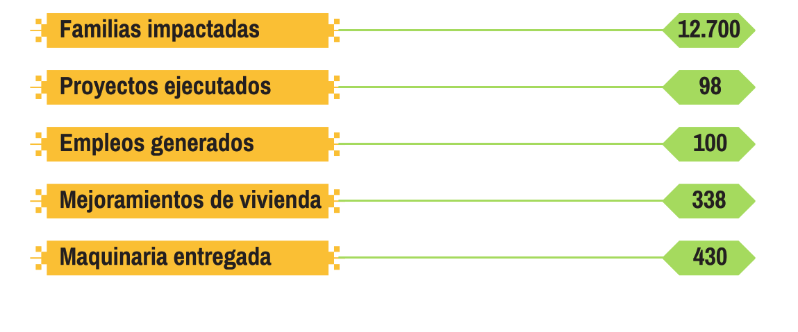 El resumen de la gestión da cuenta de más 12 700 familias impactadas, 98 Proyectos ejecutados y la generación de más de 100 empleos en la región sin dar cuenta de las oportunidades empresariales que se lograron iniciar desde la puesta en marcha de proyectos productivos que avanzan en la zona.