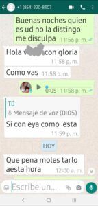 Mediante perfiles en WhatsApp, desde los números: +1 854 220 8307 // 1 585 257 6397, usaron fotografías de Gloria, para darle seguridad a las víctimas que contactaron.