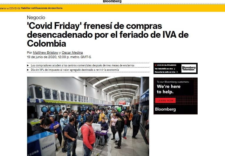 La agencia Bloomberg, una de las de mayor prestigio a nivel internacional, catalogó el primer día sin IVA en el país como ‘Covid Friday’, destacando que la reducción del 19 % de este impuesto a productos de varias categorías para los consumidores destacó un “frenesí de compras” al estilo ‘Black Friday’ en Estados Unidos, pero en puntos de venta minoristas.