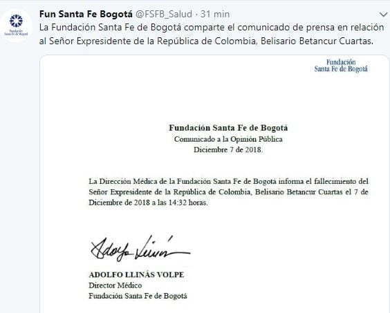 A sus 95 años, falleció en la ciudad de Bogotá, el expresidente Belisario Antonio Betancur Cuartas.