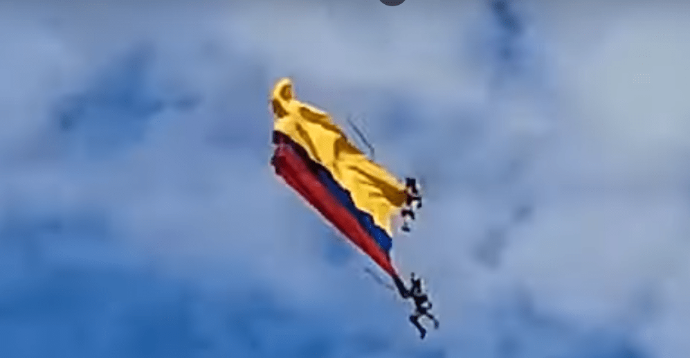 Dos militares que se movilizaban en un ejercicio de exhibición luego haber acompañado el desfile de silleteros durante las Feria de las Flores en Medellín de manera inesperada cuando finalizaban la demostración aérea se vinieron al vacío luego de que se les reventara la cuerda de la que pendían de un helicóptero de la Fuerza Aérea que exhibía una bandera de Colombia.