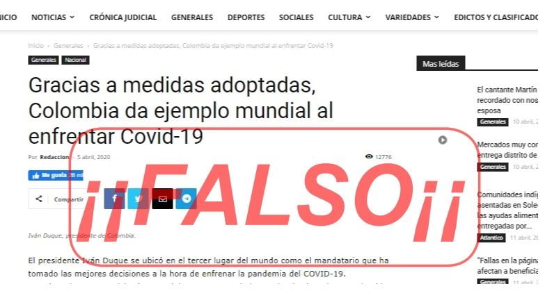 A través de Facebook y portales web se ha difundido la supuesta noticia de que el presidente Iván Duque “quedó en el tercer lugar del mundo como el mandatario que ha tomado las mejores decisiones a la hora de enfrentar la pandemia del COVID-19”.