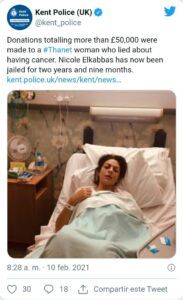 Nicole Elkabbas es una mujer de 42 años residente en el condado de kent en Inglaterra, quien usó una fotografía que le habían tomado años atrás en donde aparece en una cama de hospital, luego de que le extrajeran la vesícula, la cual publicó en una plataforma que recibe donaciones  económicas. Elkabbas había afirmado que padecía de cáncer en los ovarios y necesitaba ayuda económica para su tratamiento el cual se realizaría en España.