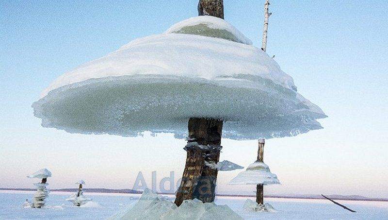Un conjunto de esculturas de hielo con forma de hongos o champiñones gigantes, han aparecido en árboles unos 200 kilómetros de Blagovéshchensk, capital de la región de Amur en el Lejano Oriente de Rusia, llamando la atención a lugareños y turistas.