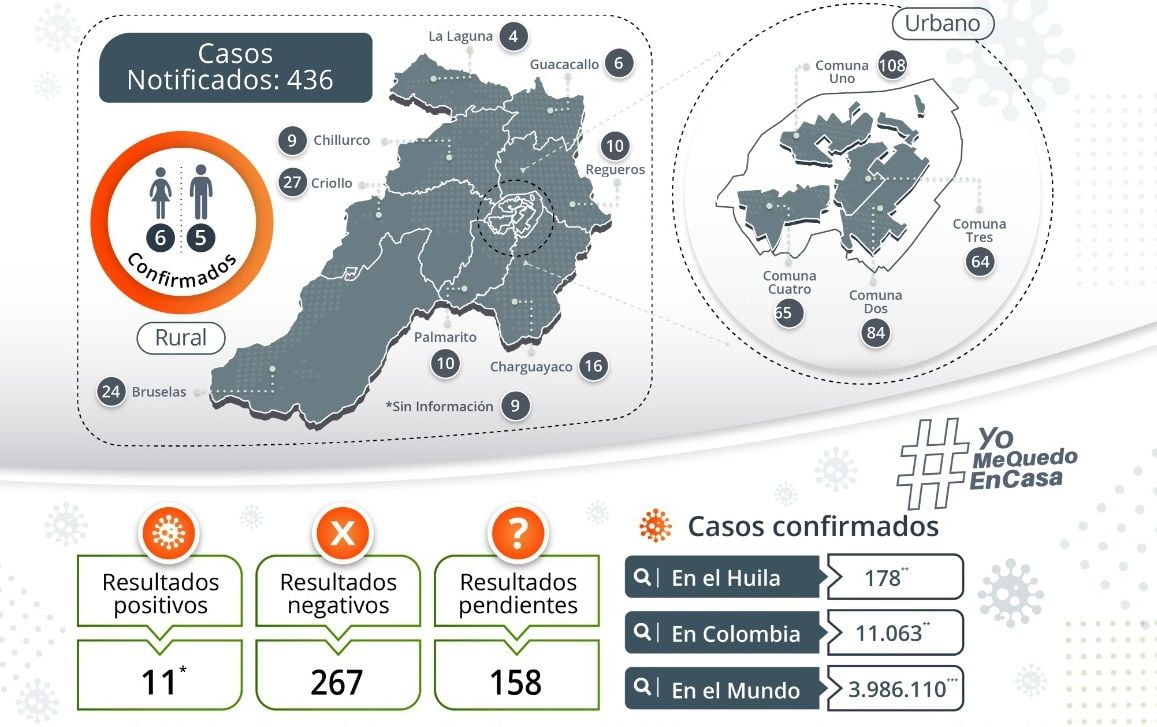 La Secretaría de Salud confirmó este hecho en el Boletín Epidemiológico número 28, el cual se notificaron 436 casos en el SIVIGILA, de los cuales 11 son positivos para Coronavirus, se mantienen los cuatro pacientes recuperados, 267 negativos y 158 pendientes de resultado.