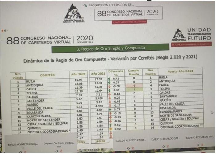 Durante la sesión virtual, Duque Orrego señaló que para la vigencia 2020 – 2021, la productividad y producción del Huila fue de 18,37%, aumentando en un 0,55 % con respecto al 17.82% donde obtuvo en el 2019.