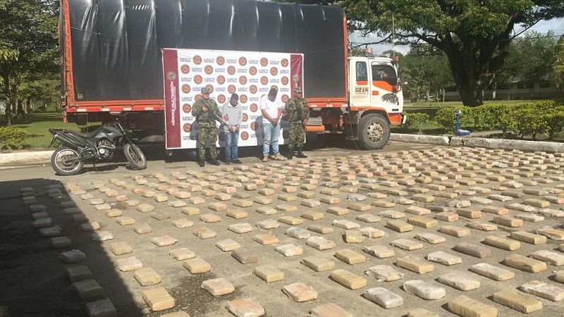 La reacción de las tropas fue inmediata, generando un puesto de control sobre el sector antes mencionado, tras la señal de pare al camión color blanco, marca Chevrolet de placa SUE674 se procedió a su inspección, hallando en su interior 21 bultos de salvado (comida para porcinos) y 186 bultos de cemento, entre los cuales estaban ocultos 784 paquetes envueltos en cinta color beige, equivalentes a 789 kilos de marihuana aproximadamente.