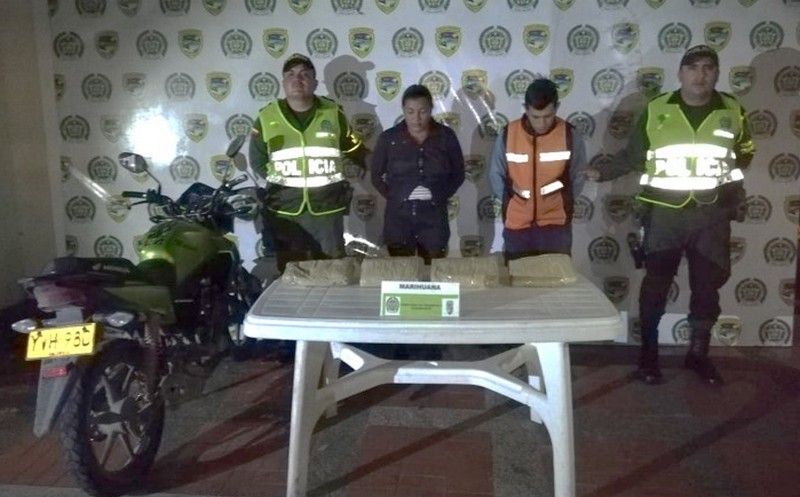 Jose Ulices Yunda Bolaños y Sindy Paola López Barón, de 29 y 24 años de edad; quienes movilizaban en una motocicleta, fueron sorprendidos por las autoridades quienes tras un registro les hallaron en sus pertenencias 2.170 gramos del alucinógeno, distribuido en cuatro paquetes envueltos en cinta.