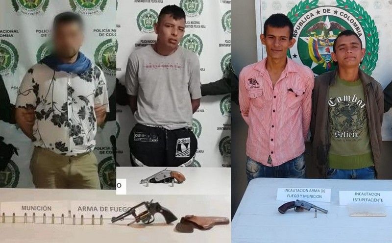 De igual manera en el parque principal del municipio de Timaná, sur del Huila, fueron capturados dos sujetos con actitud sospechosa que merodeaban en el sector y que al momento de ser requeridos emprendieron la huida para evitar el procedimiento policial; los sujetos fueron identificados como Rafael González Triviño de 22 años, más conocido como “Pichirilo” y Jorge Andrés Olaya Cedeño de 23 años, conocido como “Salchicha”, quienes tenían un revólver, calibre 38 de fabricación artesanal con un cartucho. Estos dos individuos presentan anotaciones en el sistema SPOA de la fiscalía, por delitos como hurto calificado y agravado, extorsión y violencia contra servidor público, el juez determinó enviarlos a la cárcel.