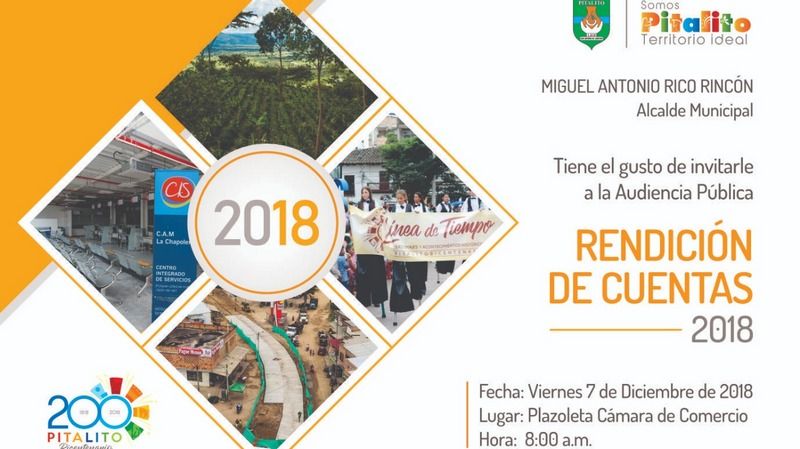 El acto de rendición de cuentas 2018 en el municipio de Pitalito – Huila, se llevará a cabo el día viernes 7 de diciembre a partir de las ocho de la mañana, en la Cámara de comercio del Neiva, seccional Pitalito.