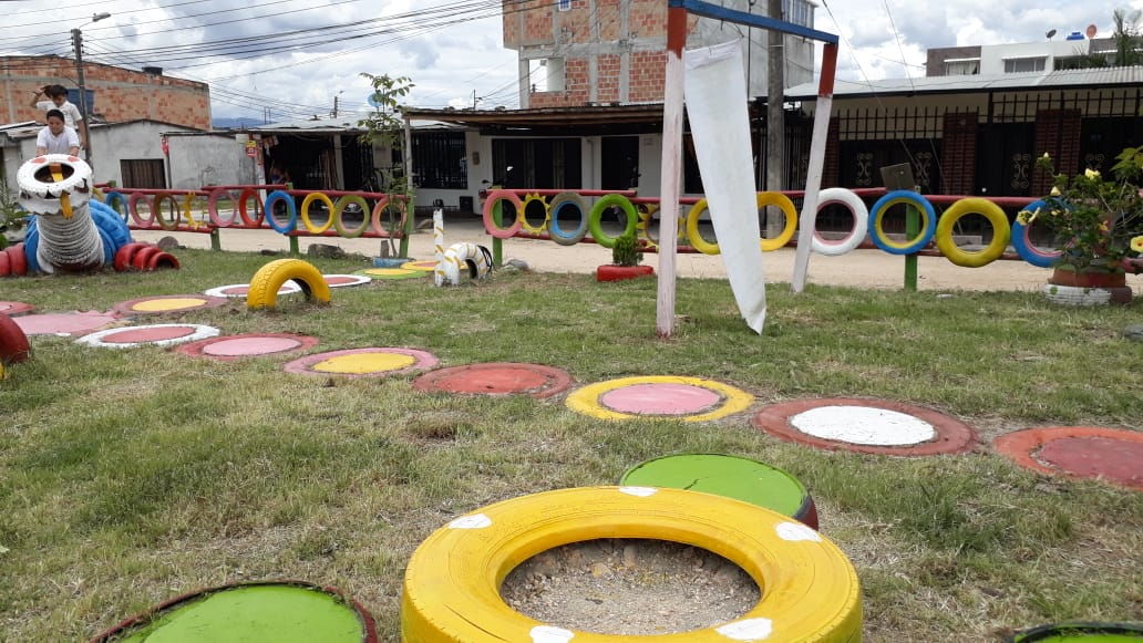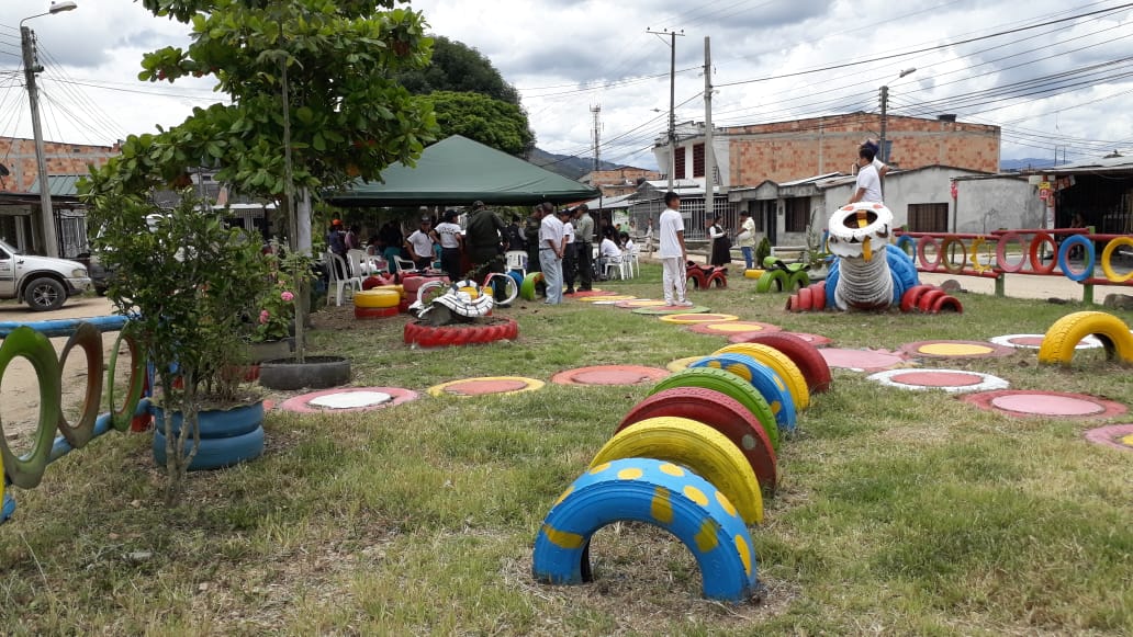 El barrio La Pradera del municipio de Pitalito, cuenta con un parque hecho con materiales reciclados; la comunidad del sector y la policía cívico infantil realizaron la recolección de llantas y pintura, elementos con los cuales iniciaron la construcción del parque en un lote baldío del sector.