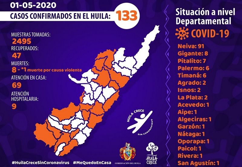 “Hoy recibimos 85 resultados negativos, incluidos 2 muestras de control que nos indican la recuperación de 2 pacientes, 1 en el municipio de Neiva y 1 en El Agrado, para un total de 47 personas recuperadas” informó Cesar Alberto Polanía, secretario de Salud del Huila.