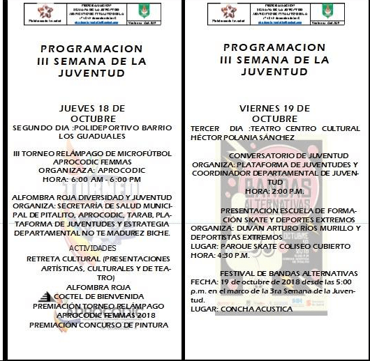 Correspondiente a la celebración de la “tercera versión de la semana de la juventud”, con participación de distintas entidades e instituciones de orden oficial y no oficial.