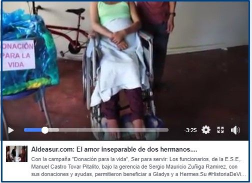 Tras la muerte de su esposo hace casi un año, es su progenitora la señora Ana Yagüe quien ahora se hace cargo de ella. En el caso de María además de los mercados se le obsequió un teclado de computador, para poder comunicarse y una silla de ruedas donada por el gerente de la entidad, Sergio Mauricio Zúñiga Ramírez, para que sus familiares puedan movilizarla.