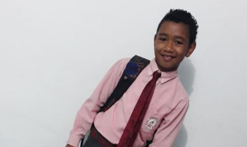 El menor, estudiante de séptimo grado, viste el uniforme de deporte del colegio sudadera y chaqueta azul oscuro con rayas blancas y rojas, y tenis rojos.