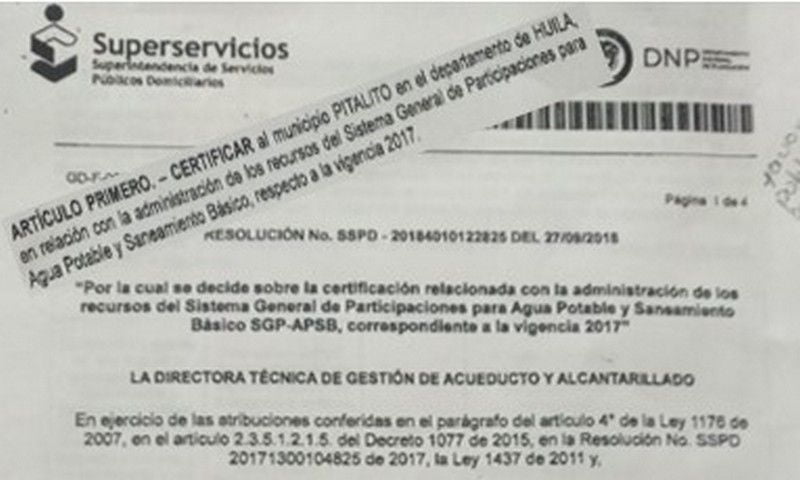 Mediante Resolución SSPD – 20184010122825 del 29 de Septiembre de 2018, la Superintendencia de servicios públicos domiciliarios define la certificación para el Municipio de Pitalito y su prestador de servicios de acueducto, alcantarillado y aseo Empitalito E.S.P., en relación con los recursos del sistema general de participaciones para Agua Potable y Saneamiento Básico correspondiente a la vigencia 2017.