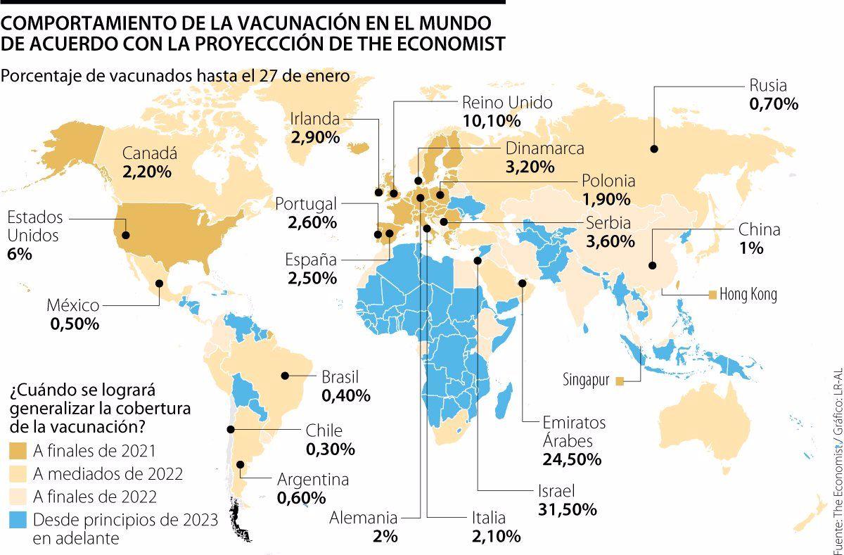 Cuando se revisa el mapa de vacunación global, se ve que a un mes de haber iniciado los programas de vacunación en el mundo, países como Israel reportan 31,5% de la población total vacunada; Emiratos Árabes Unidos, 24,5%, y Reino Unido, 10,1%.