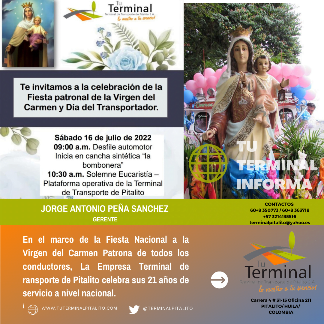 La Empresa Terminal de Transporte de Pitalito, con el apoyo de la Vicaria de San Juan, el acompañamiento de todas las parroquias y las empresas transportadoras, rinden homenaje a La Virgen del Carmen, patrona de los conductores, este SÁBADO 16 de julio del año en curso.