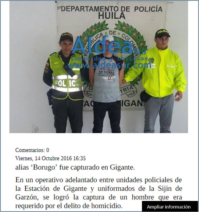 Los testigos dieron aviso a los uniformados del cuadrante, quienes gracias a la oportuna reacción y en un cerco realizado lograron la captura de los presuntos agresores momentos en que se movilizaban en una motocicleta y a quienes les hallaron el machete, elemento con el que asesinaron al individuo; la retención fue efectuada cerca de la ciudadela Matambo vía que conduce a la vereda Tres Esquinas.