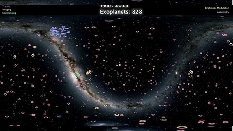 El vídeo muestra el método de detección en colores: Velocidad radial en rosa, Tránsito en púrpura, Directo en naranja y Microlentes en verde.
