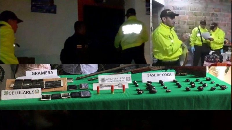 2 armas de fuego, 3 cartuchos calibre 16, 27 envolturas con Bazuco (300 gramos aproximadamente), 2 grameras para el pesaje y dosificación y 12 celulares.